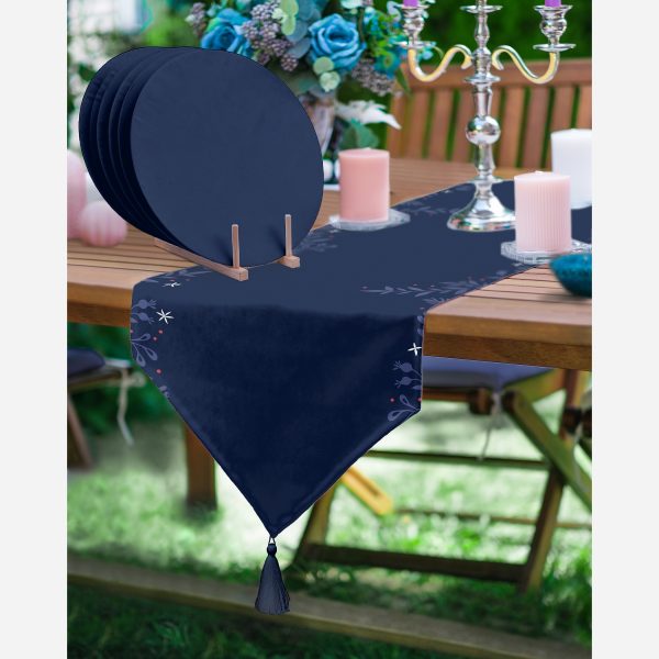 Lacivert Zeminli Çiçek Çerçeveli Dijital Baskılı Dekoratif Üçgen Püsküllü Runner 1 Adet & 6 Adet Lacivert Rengarenk Supla