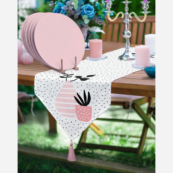 Krem Kumlama Zemin Vazo Desenli Dijital Baskılı Modern Üçgen Püsküllü Runner 1 Adet & 6 Adet Pembe Renkli Supla