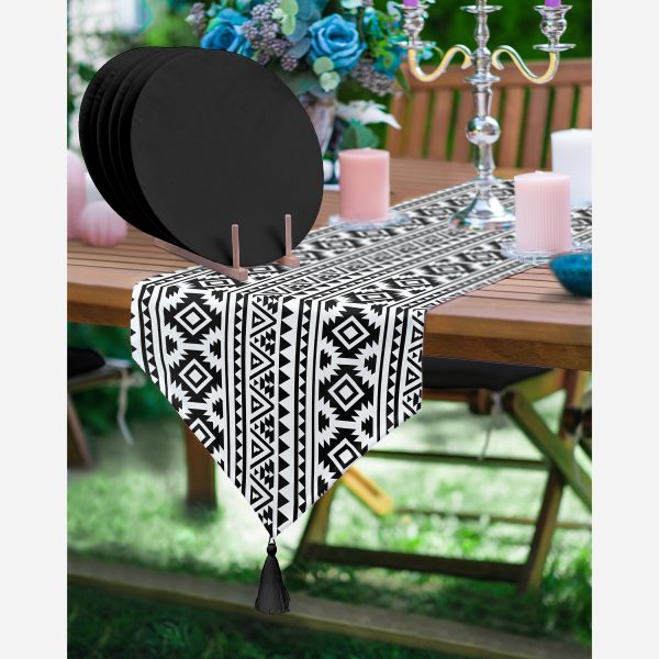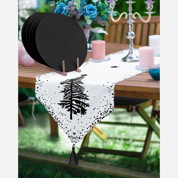 Siyah Beyaz Çam Ağacı Motifli Modern Üçgen Püsküllü Runner 1 Adet & 6 Adet Siyah Renkli Supla