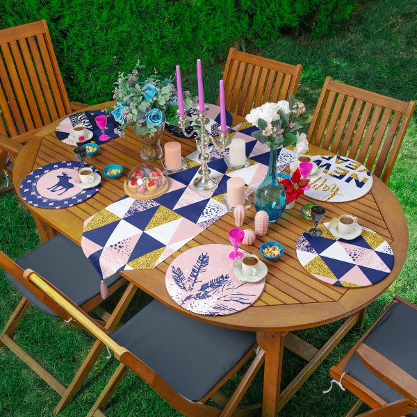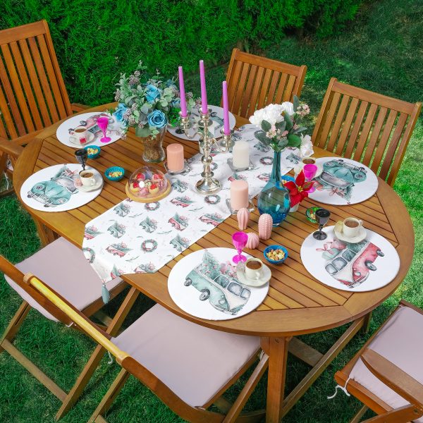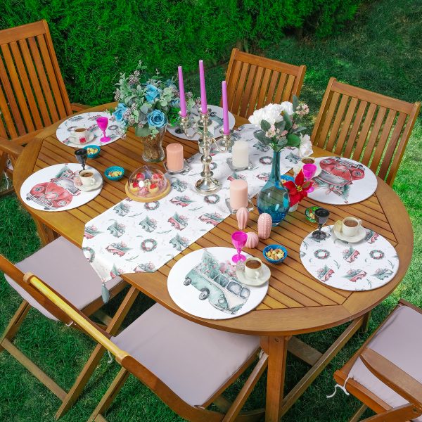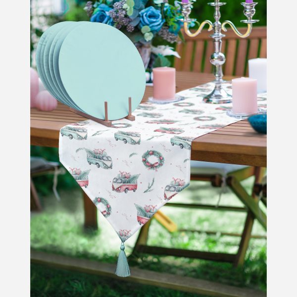 Christmas Temalı Araba Tasarımlı Dijital Baskılı Üçgen Püsküllü Runner 1 Adet & 6 Adet Açık Mavi Renkli Supla