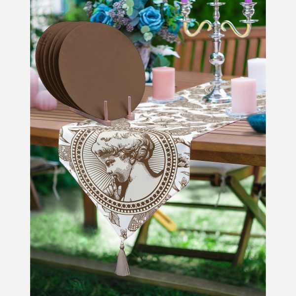 Karakalem Çiçek & Portre Desenli Dijital Baskılı Dekoratif Üçgen Püsküllü Runner 1 Adet & 6 Adet Kahverengi Rengarenk Supla