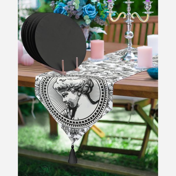 Karakalem Çiçek & Portre Desenli Dijital Baskılı Dekoratif Üçgen Püsküllü Runner 1 Adet & 6 Adet Siyah Rengarenk Supla