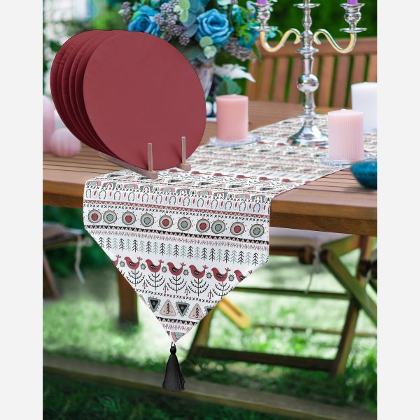 Etnik İskandinav Motifli Dijital Baskılı Dekoratif Üçgen Püsküllü Runner 1 Adet & 6 Adet Bordo Renkli Supla