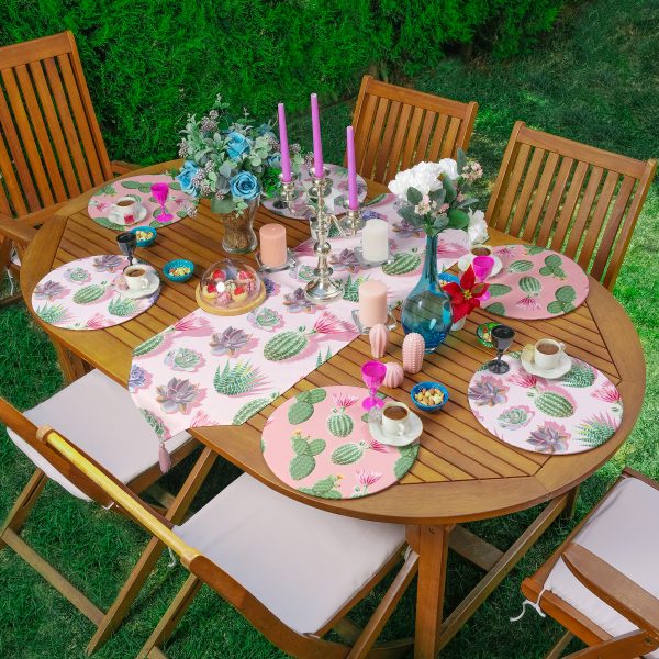 Pembe Zemin Kaktüs Motifli Özel Tasarım 6+1 Supla Runner Seti