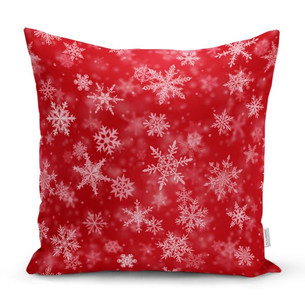 Kırmızı Zeminde Kar Taneleri Dekoratif Yastık Kırlent Kılıfı