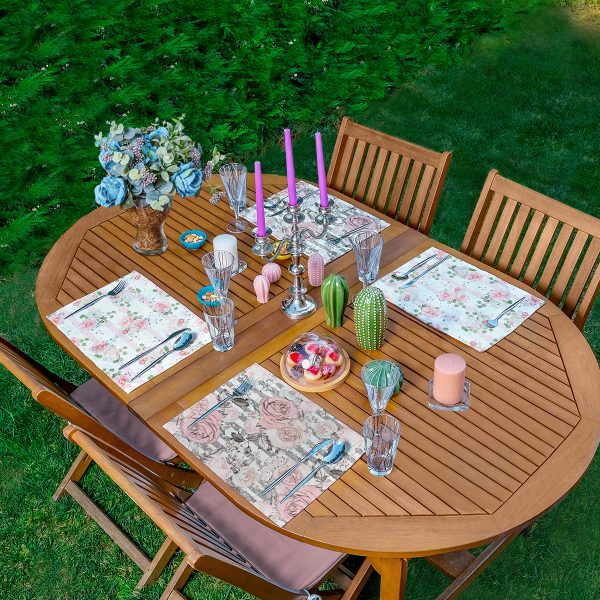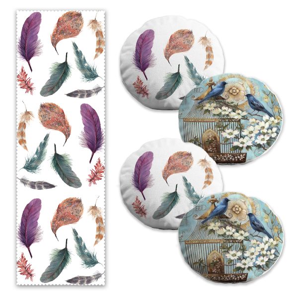 Yaprak ve Kuş Tasarımlı 4 Yuvarlak Kırlent Kılıfı ve 1 Runner Seti