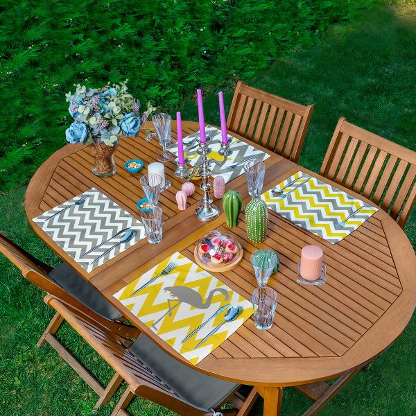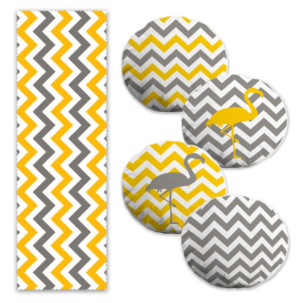 Sarı & Gri Zigzag ve Flamingo Motifli 4 Yuvarlak Kırlent Kılıfı ve 1 Runner Seti