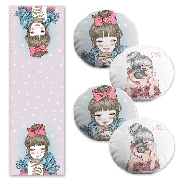 Kahve İçen & Fotoğraf Çeken Kız Tasarımlı 4 Yuvarlak Kırlent Kılıfı ve 1 Runner Seti