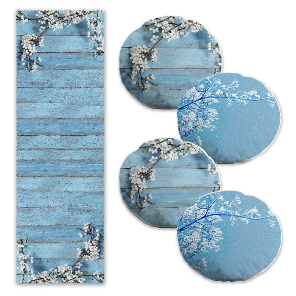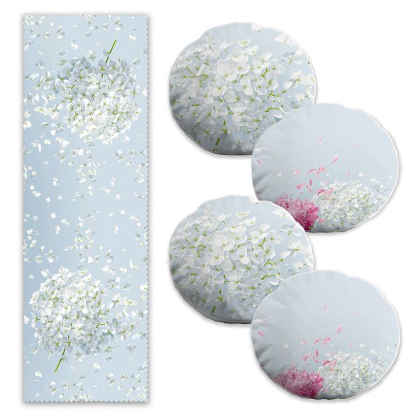 Mavi Zeminde Ortanca Çiçeği Tasarımlı 4 Yuvarlak Kırlent Kılıfı ve 1 Runner Seti