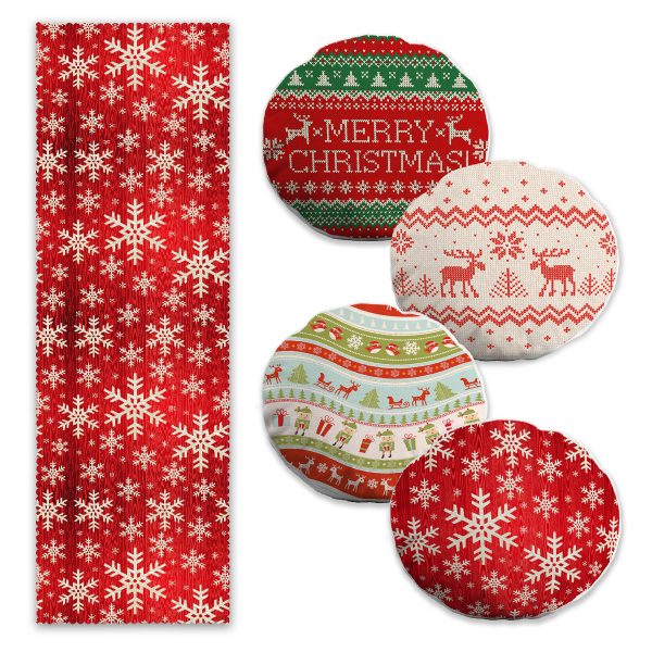 Kırmızı Zeminde Kar Tanesi Motifli 4 Yuvarlak Kırlent Kılıfı ve 1 Runner Seti