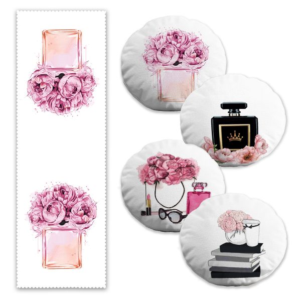 Parfüm Şişesi Tasarımlı 4 Yuvarlak Kırlent Kılıfı ve 1 Runner Seti