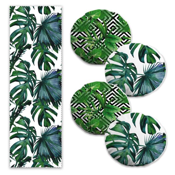 Yaprak Motifli 4 Yuvarlak Kırlent Kılıfı ve 1 Runner Seti