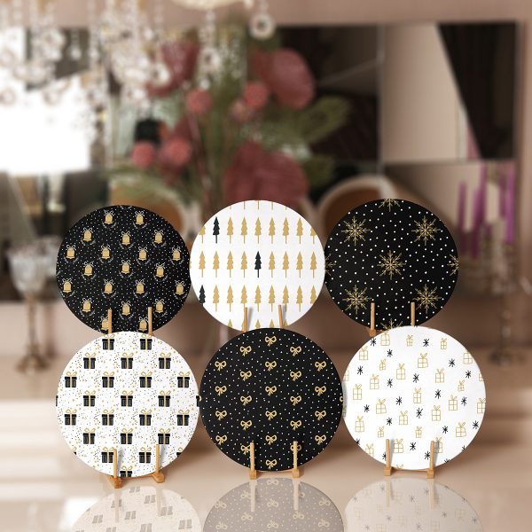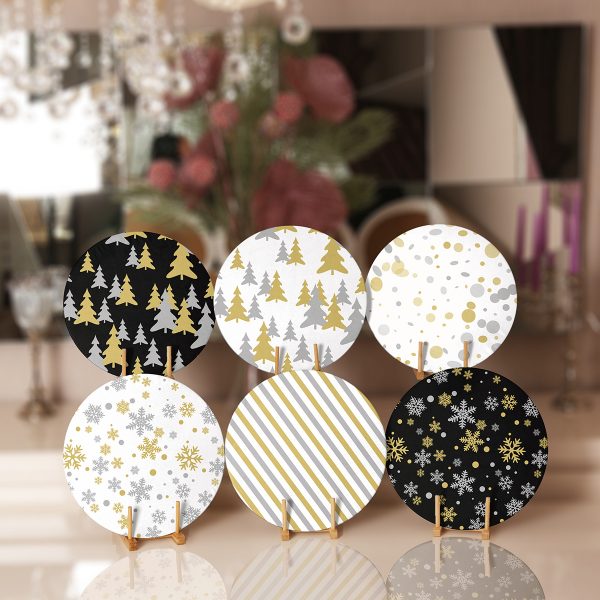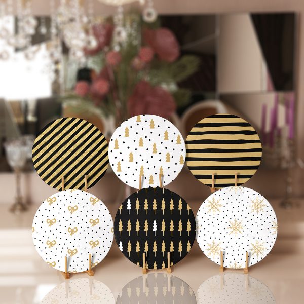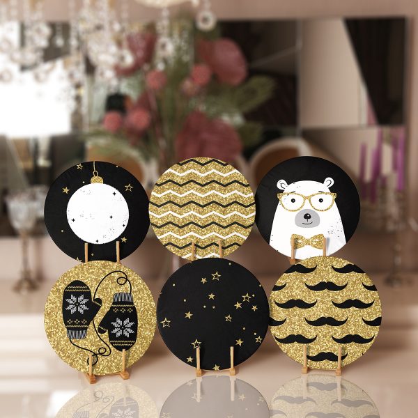 6’lı Gold Detaylı Siyah Beyaz Yılbaşı Temalı Servis Altlığı & Supla