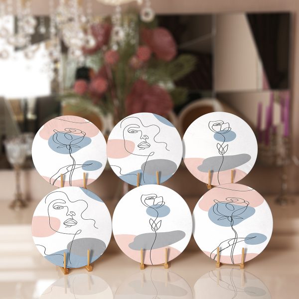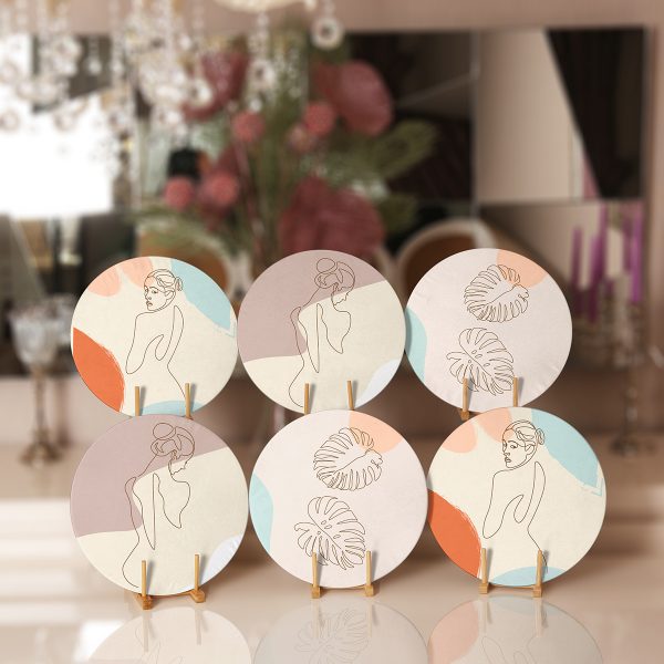 6’lı Renkli Zemin Üzerinde Onedraw Çizimli Bayan Silüeti Motifli Servis Altlığı & Supla