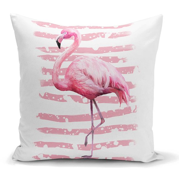 Pudra Çizgi Desenli Flamingo BAskılı Dekoratif Yastık Kırlent Kılıfı