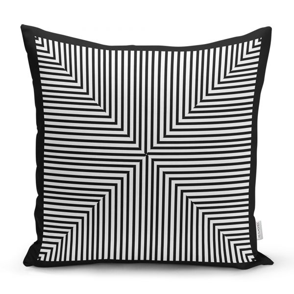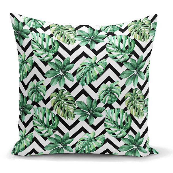 Zigzag Siyah Beyaz Şerit Temalı Yaprak Çizimi Kırlent Kılıfı