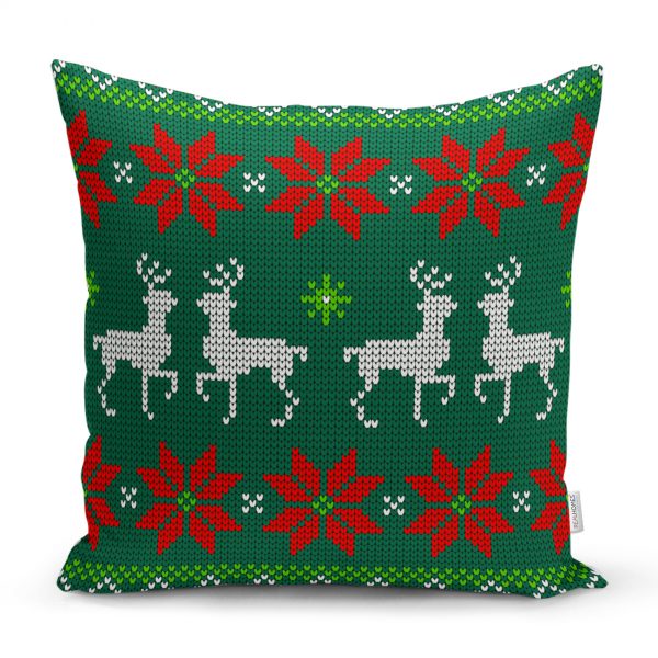 Yeşil Zeminde Yılbaşı Geyikleri Desenli Dekoratif Yastık Kırlent Kılıfı