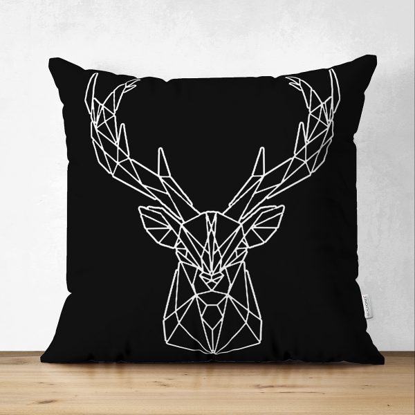 Çift Taraflı Siyah Zeminli Geometrik Geyik Çizimli Modern Süet Yastık Kırlent Kılıfı