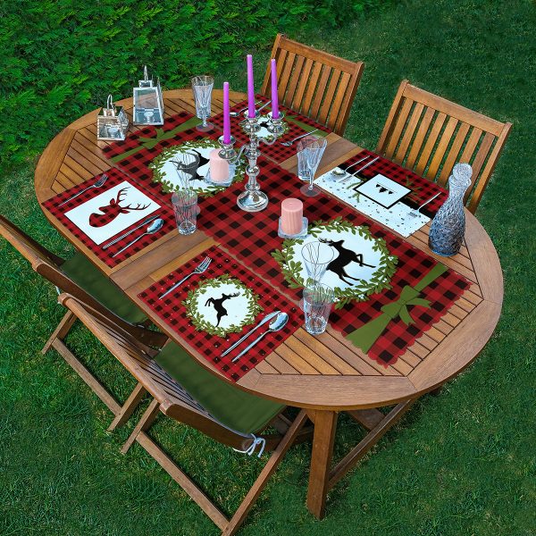 4+1 Kırmızı Ekose Motifli Geyik Tasarımlı Amerikan Servis & Runner Seti