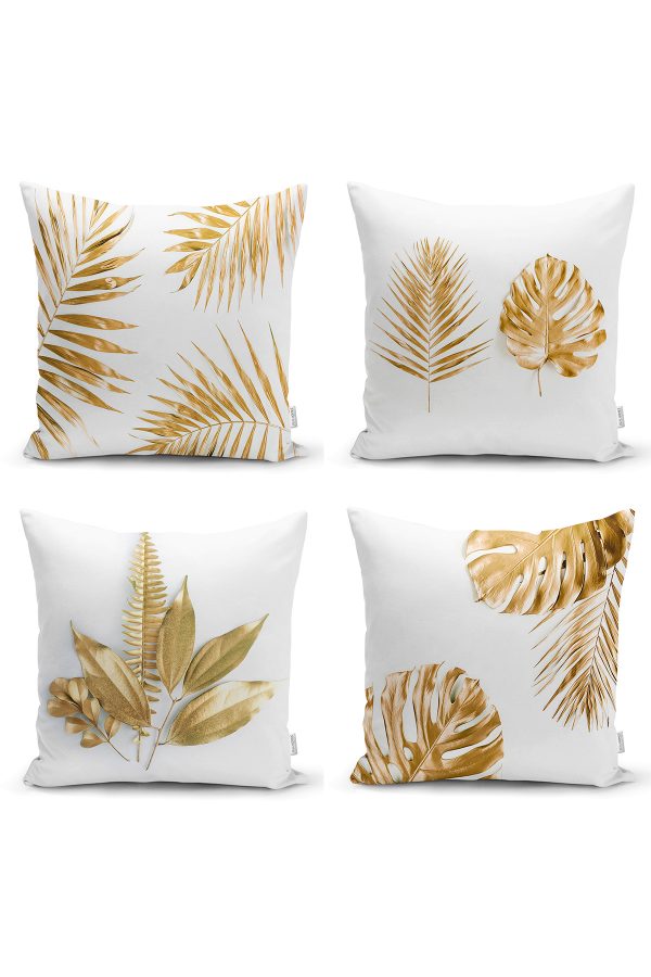 Altın Varaklı Yaprak Desenli 4’lü Yastık Kırlent Kılıf Seti