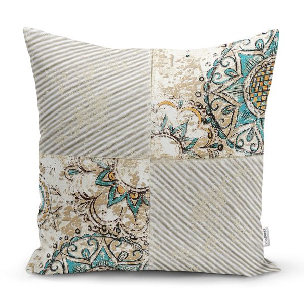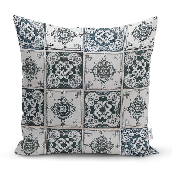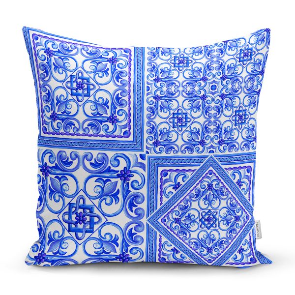 Beyaz Zemin Üzerinde Çini Desenli Dijital Baskılı Modern Yastık Kırlent Kılıfı