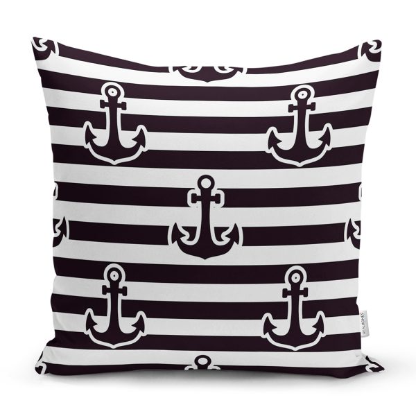 Beyaz Zemin Üzerinde Siyah Çizgili Çapa Desenli Modern Yastık Kırlent Kılıfı