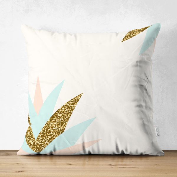 Çift Taraflı Açık Krem Zeminli Pembe Mavi Gold Yapraklar Dijital Baskılı Modern Süet Yastık Kılıfı