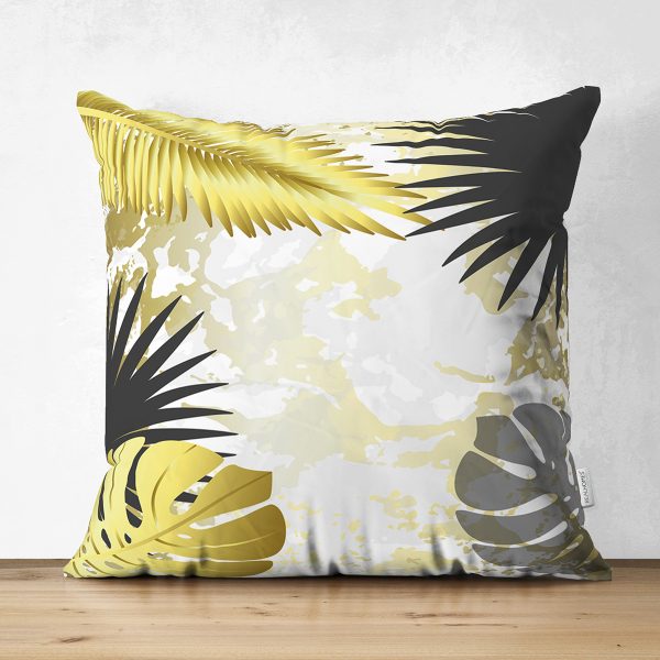 Çift Taraflı Mermer Zeminli Gold Ve Siyah Yapraklar Dijital Baskılı Modern Süet Kırlent Kılıfı