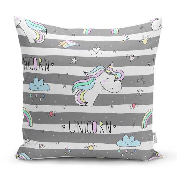 Gri Beyaz Çizgili Unicorn Atlar Çocuk Odası Yastık Kırlent Kılıfı