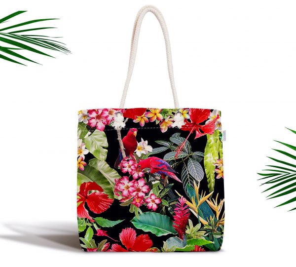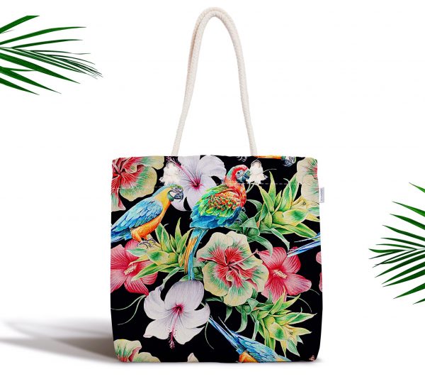 Siyah Zeminde Watercolor Tropikal Desenli Dijital Baskılı Kumaş Çanta