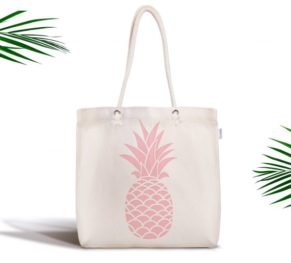 Beyaz Zeminde Pembe Ananas Tasarımlı Dijital Baskılı Fermuarlı Kumaş Çanta