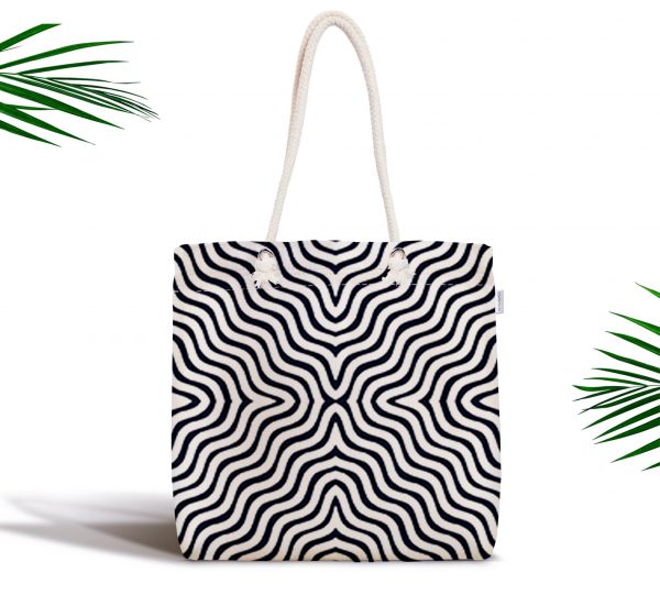 Siyah Geometrik Çizgiler Özel Tasarımlı Fermuarlı Modern Kumaş Çanta