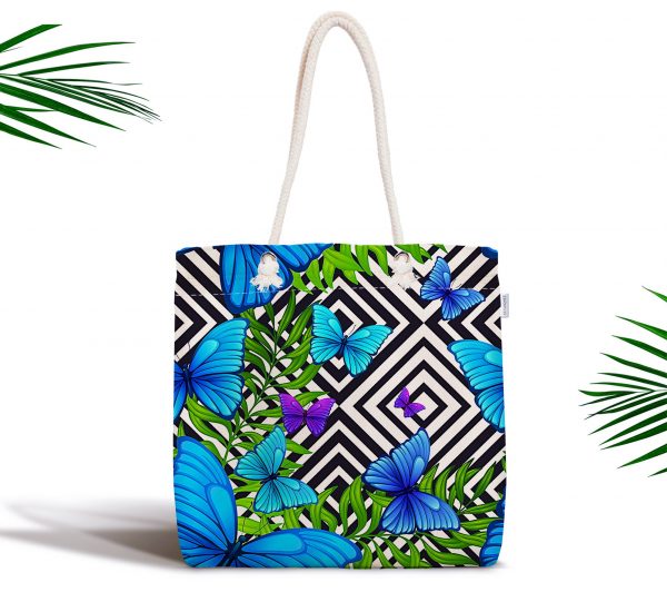 Geometrik Zeminli Mavi Kelebek Baskılı Fermuarlı Kumaş Çanta