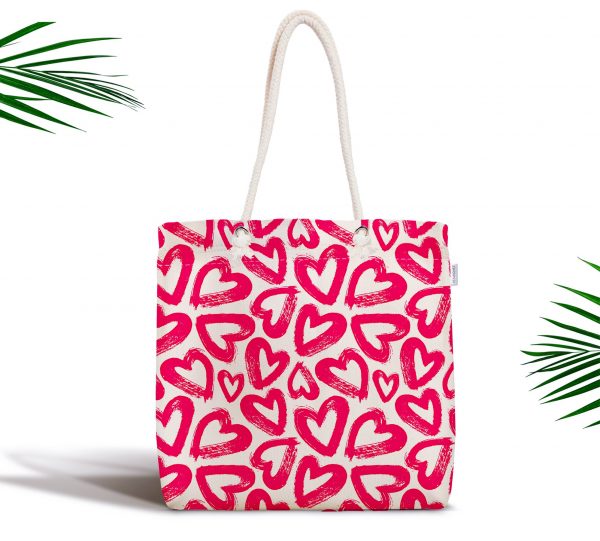 Modern Çizimli Kalpler Tasarımlı Dijital Baskılı Fermuarlı Kumaş Çanta