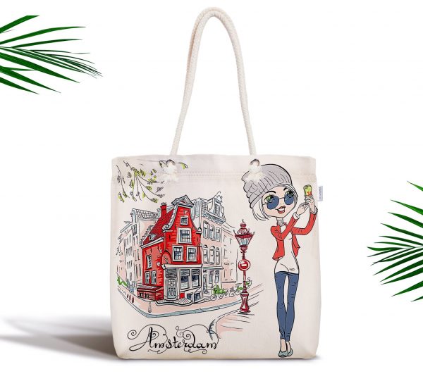 Amsterdam Temalı Özel Tasarım Dijital Baskılı Fermuarlı Kumaş Çanta