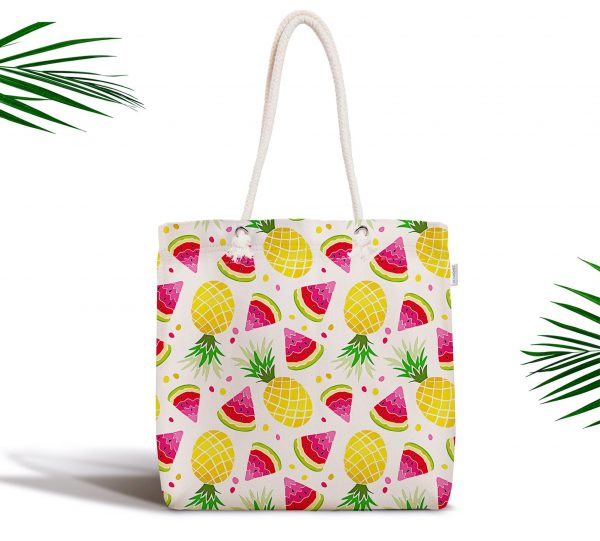 Watercolor Karpuz Ananas Desenli Dijital Baskılı Fermuarlı Plaj Çantası