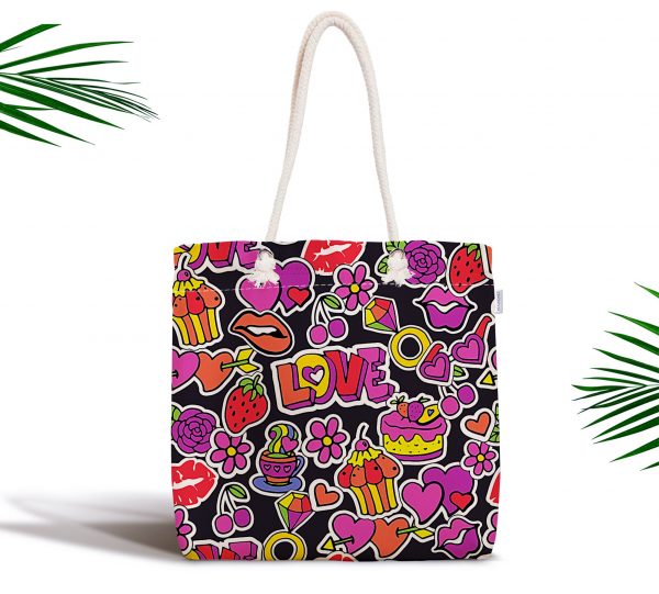Siyah Zeminde Love Özel Tasarımlı Dijital Baskılı Fermuarlı Kumaş Çanta