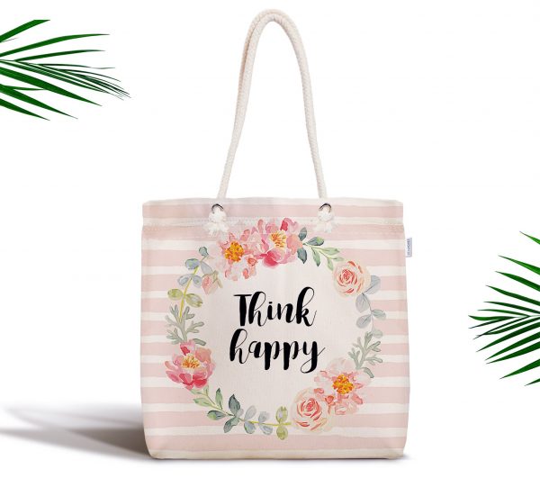 Çiçek Motifli Think Happy Baskılı Fermuarlı Kumaş Çanta