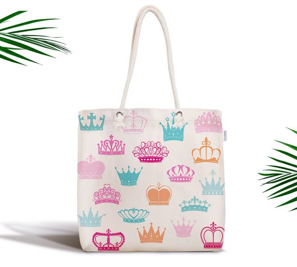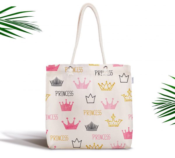 Pudra Renk Prenses Taç Motifli Dijital Baskılı Fermuarlı Kumaş Çanta