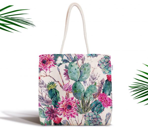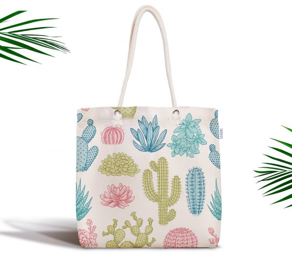 Kaktüs Desenli Renkli Modern Fermuarlı Kumaş Çanta