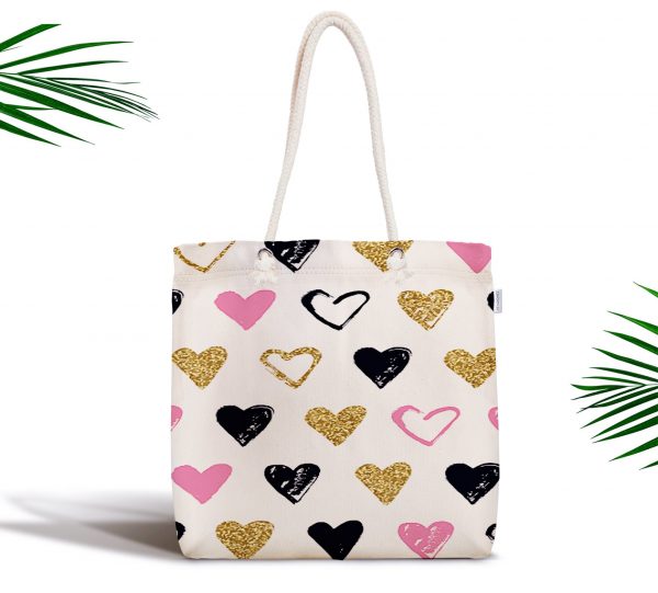 Çizgili Yaldızlı Kalpler Dijital Baskılı Fermuarlı Modern Kumaş Çanta