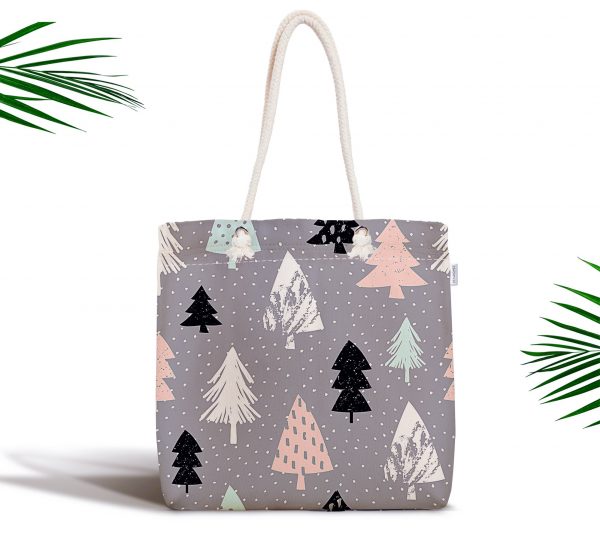 Gri Zeminli Ağaç Temalı Dijital Baskılı Fermuarlı Kumaş Çanta