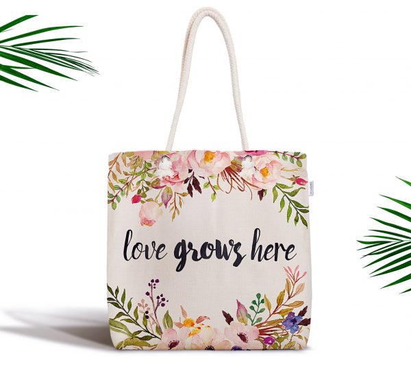Love Grows Here Yazılı Dijital Baskılı Fermuarlı Kumaş Çanta