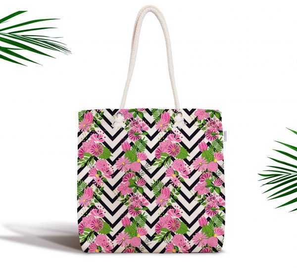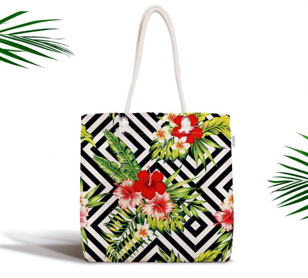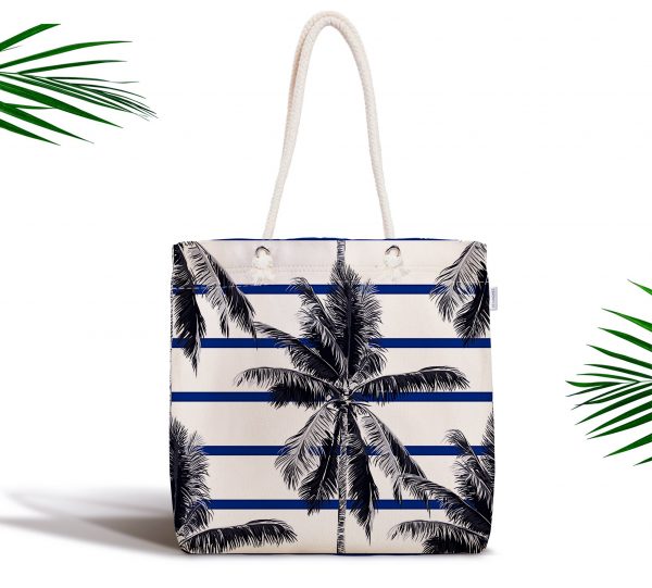 Çizgili Palmiye Yaprakları Fermuarlı Modern Kumaş Çanta