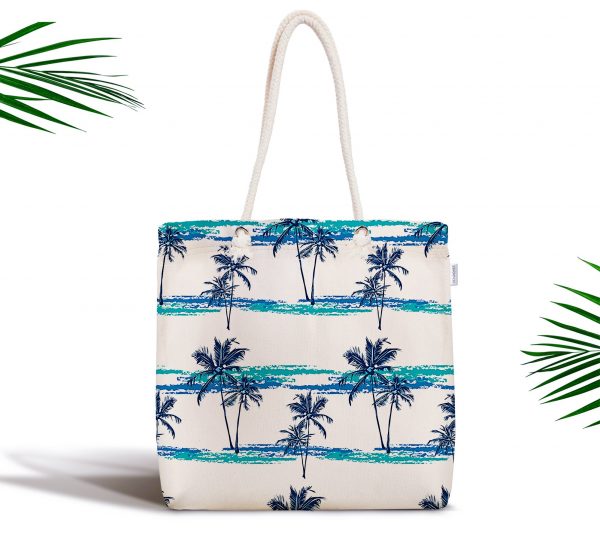 Mavi Yeşil Palmiye Çizimli Fermuarlı Modern Kumaş Çanta