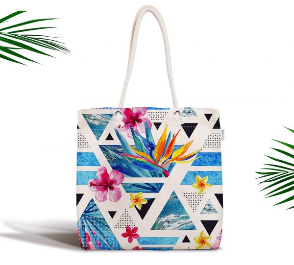 Mavi Geometrik Palmiye Desenleri Fermuarlı Kumaş Çanta