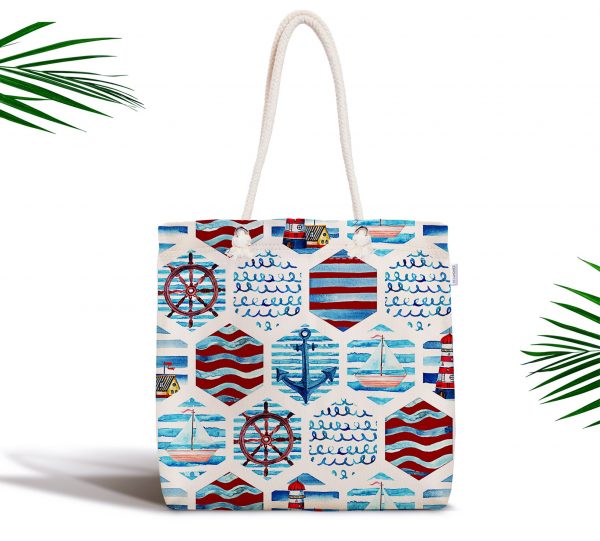 Bordo Mavi Denizci Motifli Dijital Baskılı Fermuarlı Kumaş Çanta