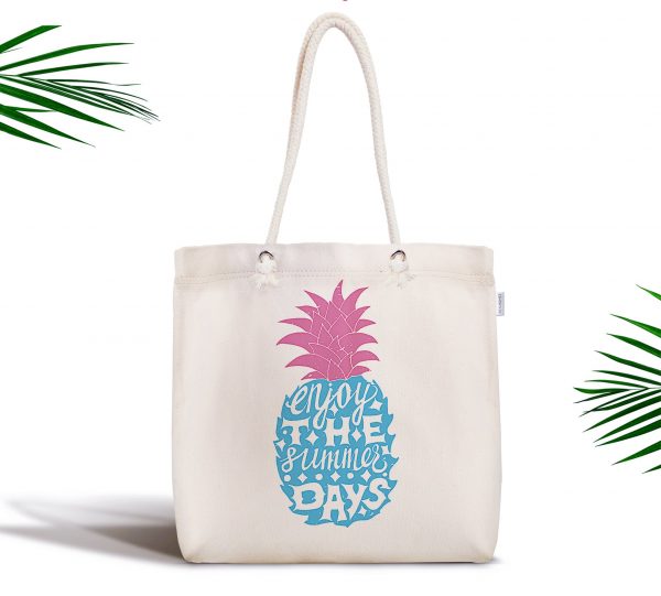 Mavi Ananas Tasarımlı Dijital Baskılı Fermuarlı Kumaş Çanta