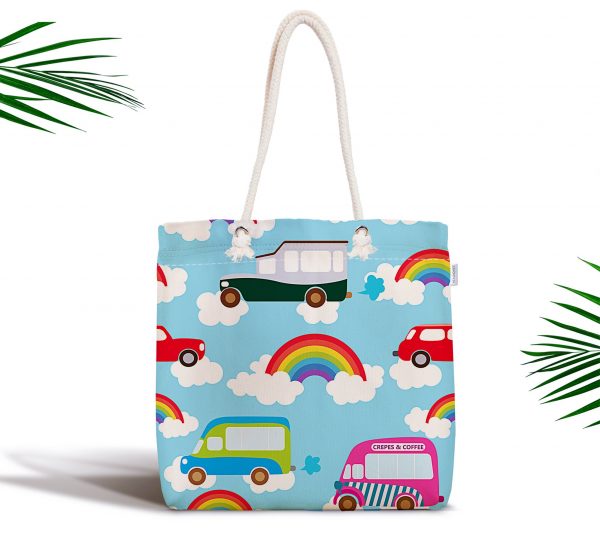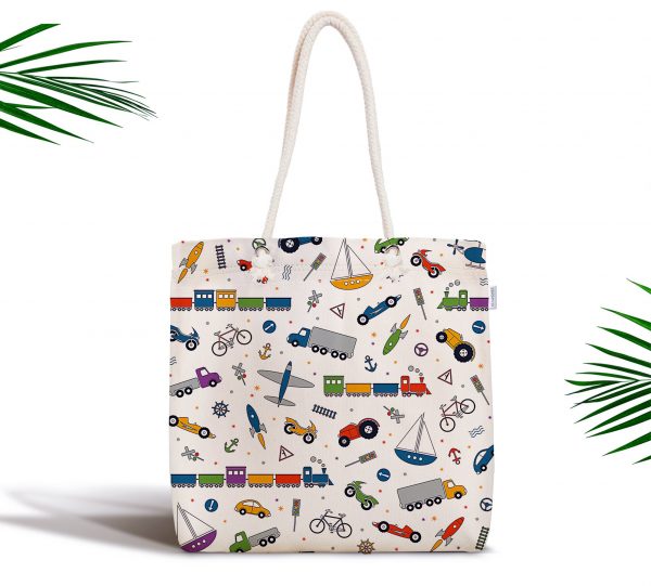 Beyaz Zeminde Arabalar Dijital Baskılı Fermuarlı Kumaş Çanta