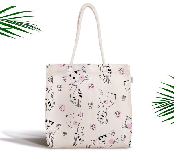 Kedi Desenli Dijital Baskılı Fermuarlı Kumaş Çanta
